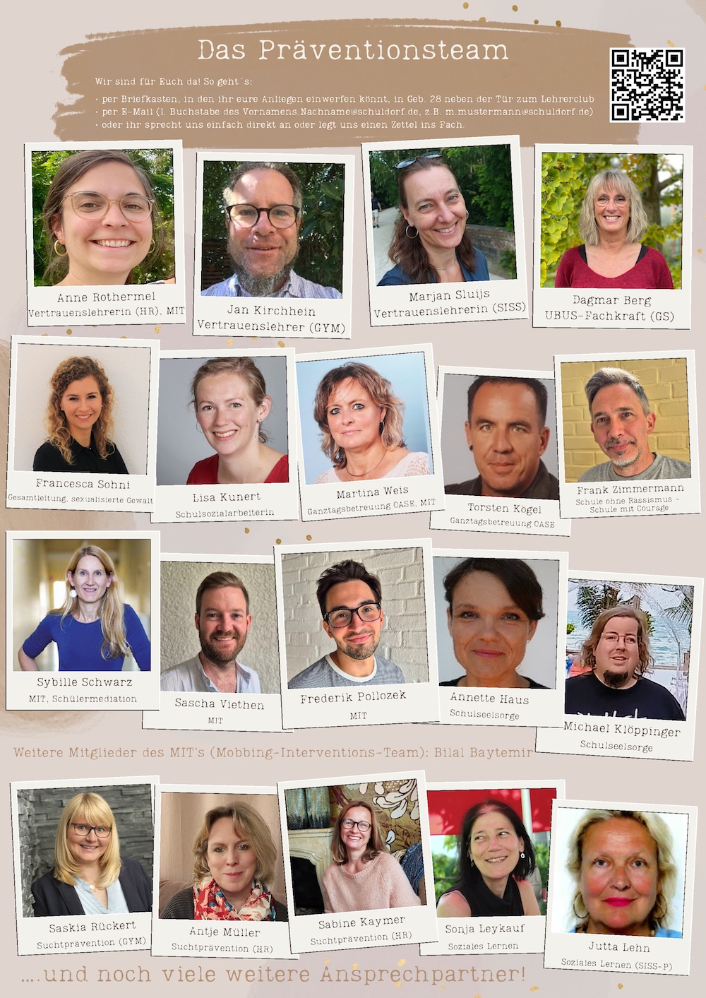 Je nach Schulzweig sind wir für Euch da und bieten vertrauliche Beratung und Weiterleitung an externe Beratungsstellen (Wildwasser und Kinderschutzbund) an: Francesca Sohni (GYM), Jutta Lehn (SISS-P), Astrid Koniarski (SISS-PR), Marjan Sluijs (SISS-SEC) und Torsten Kögel und (HR).