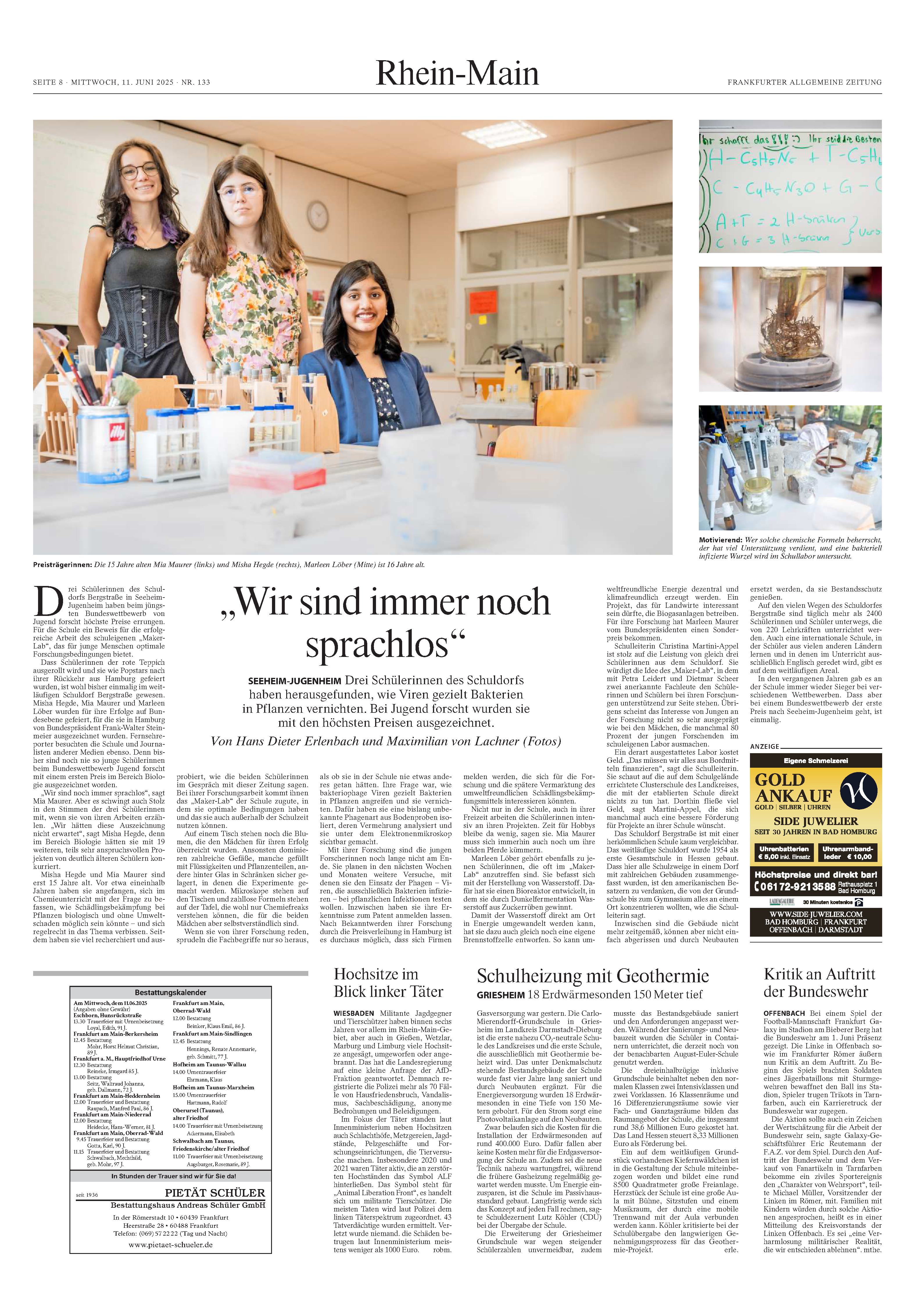tinywow F A Z 11.06.2025 81554591 41 KopieDie Frankfurter Allgemeine Zeitung widmet in ihrer Ausgabe vom 11. Juni 2025 einen ausführlichen Artikel drei Schülerinnen des Schuldorfs Seeheim-Jugenheim. Mia Mauer, Misha Hegde und Minay Lobur wurden beim Wettbewerb Jugend forscht für ihr innovatives Forschungsprojekt ausgezeichnet: