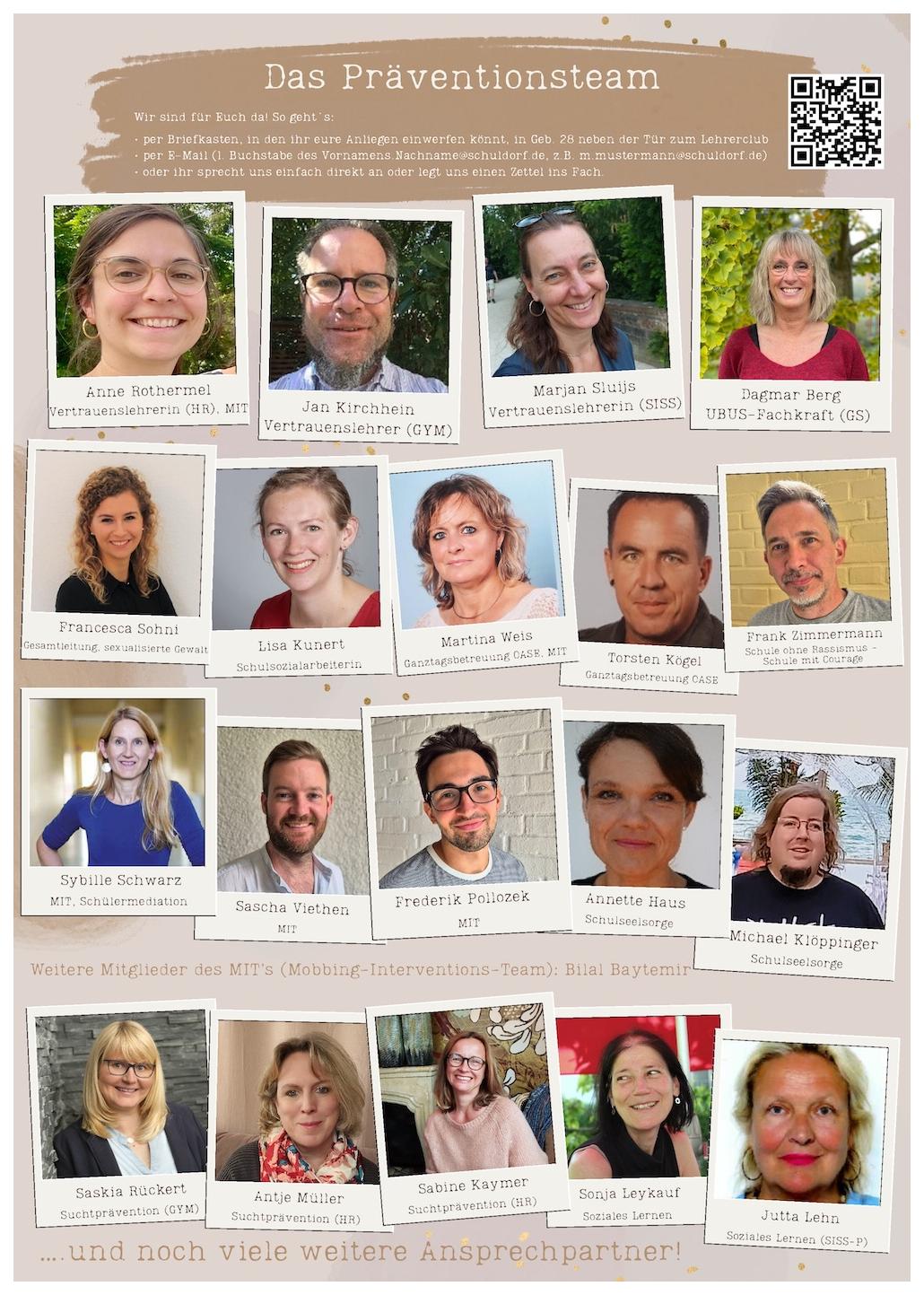 Das Praeventionsteam mit RandDas Präventionsteam am Schuldorf Bergstraße vereint verschiedene Beratungs- und Hilfsangebote für Schülerinnen und Schüler, Lehrkräfte und Eltern.